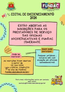 A FUNDAÇÃO DA CRIANÇA E DO ADOLESCENTE DE UBATUBA – FUNDAC torna público que se encontra aberto o CREDENCIAMENTO Nº 01/2026, a ser realizado na forma eletrônica, por meio da plataforma https://bll.org.br, constituindo procedimento auxiliar, nos termos do art. 78, inciso IV, da Lei Federal nº 14.133/2021, destinado ao credenciamento de pessoas jurídicas interessadas na prestação de serviços técnicos especializados voltados à execução de Oficinas Socioeducativas e do Projeto FUNDAC Itinerante.